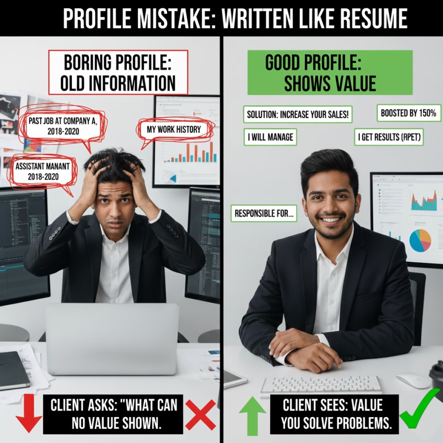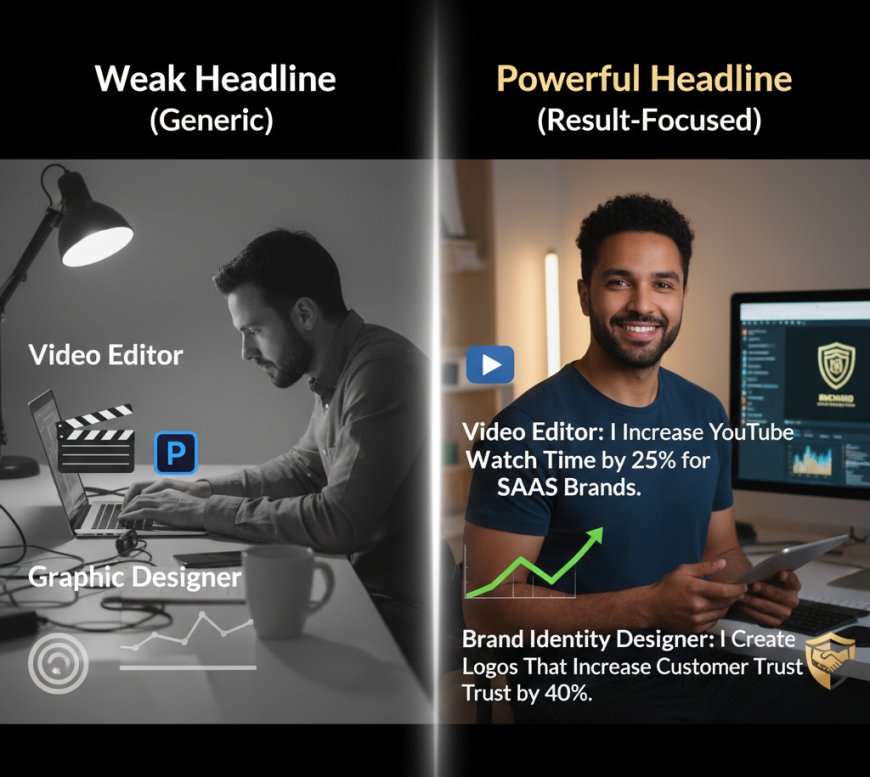 ▶ Formula: [Your Niche Role] + [Target Client/Niche] + [Specific Measurable Outcome] Expert Tip: Use a professional, clear photo (headshot, not a selfie) as well. Data Insight: Profiles with professional photos are significantly more likely to be hired.